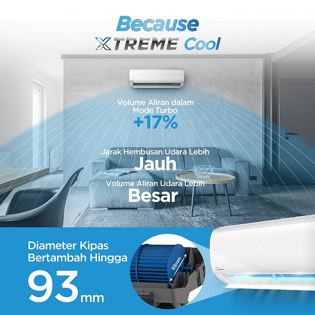 AC MIDEA 1/2 PK MSFC-05CRN2X STANDARD XTREME DURA MSFC SERIES (4.500 BTU/H) R32 pendinginan cepat dengan desain elegan, dilengkapi LED display serta lapisan anti karat. Dilengkapi dengan berbagai fitur unggulan seperti Xtreme Dura, Low Voltage, Self Cleaning, Compressor Intelligent Alert, High Density Filter, Cold Catalyst Filter, Sleep Mode, Turbo Cool, Auto Restart, Self-Diagnosis, dan Auto Protection.